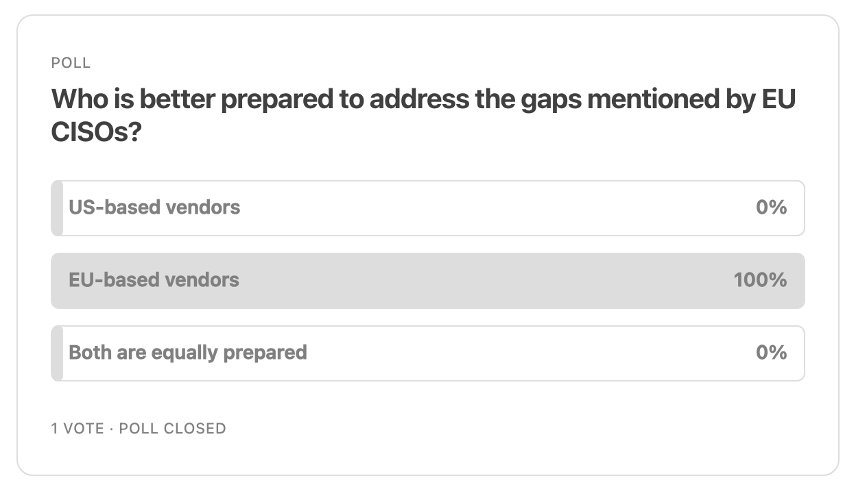They also highlight that there are cultural and operational gaps, with US vendors employing different standards and best practices compared to the ones expected by European customers. There’s a cultural disconnect in many occasions, rooted in different business practices according to the consulted CISOs, and they’d welcome more effort from US vendors in meeting them half way when communicating.